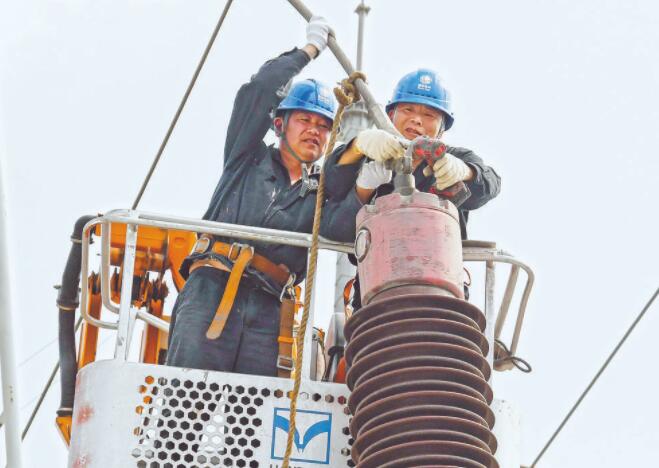 圖為檢修人員檢查變壓器高壓側(cè)引流線。(陳蒸 攝)