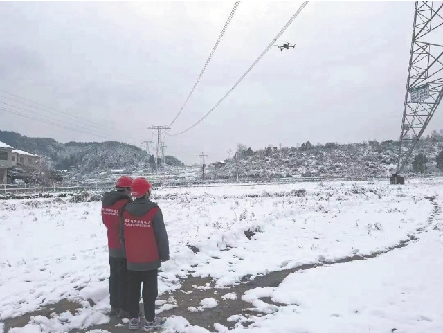 國網(wǎng)湖南電力員工開展無人機自適應(yīng)巡檢,完成防凍融冰保電工作任務(wù)。國網(wǎng)湖南電力供圖
