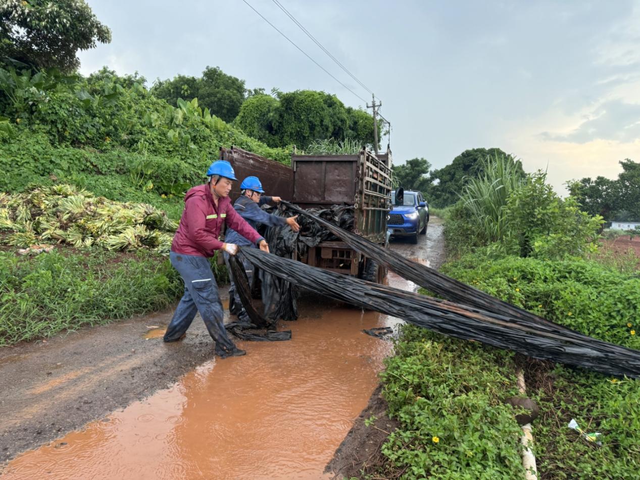 9月5日,南網(wǎng)超高壓公司??诜志謫T工與村民一起冒雨清理一處塑料地膜,徹底消除此處飄掛物隱患。朱陽 攝