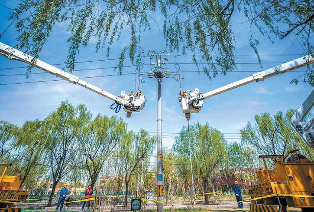 國(guó)網(wǎng)北京電力帶電作業(yè)人員在海淀區(qū)西北旺永豐地區(qū)進(jìn)行配電網(wǎng)帶電綜合檢修作業(yè)。劉小軍 攝