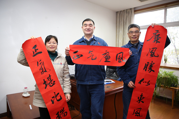 寧柏偉給該公司總經部、財務部、燃運部、思政部、前期辦以及法律(風控)事務部等部門贈送了廉潔春聯(lián)。每到一處,寧柏偉親自將春聯(lián)送到各部門負責人手中,并合影留念表達新年祝福。他談到,此次送廉政春聯(lián)活動,該公司紀委首次將范圍擴大到全體部門,通過開展為部門送廉政春聯(lián)活動,寓教于樂,宣傳廉政紀律,提醒領導干部員工時刻繃緊廉潔自律線,清廉、祥和過春節(jié);同時將廉政文化元素融入春聯(lián)之中,展示了中國傳統(tǒng)文化,以喜慶的形式弘揚清風正氣,傳遞廉潔正能量。