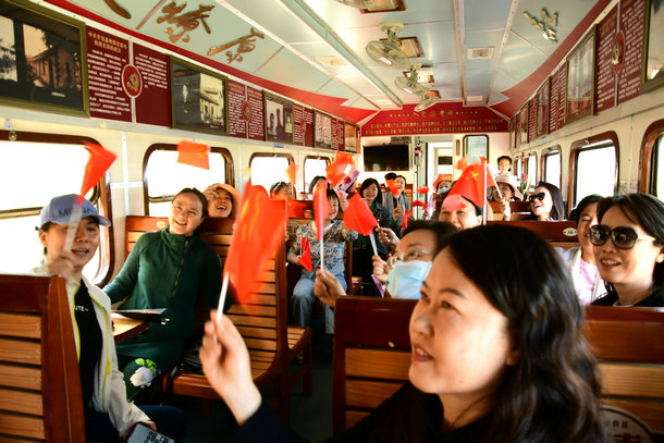 伴隨著交通列車從站臺(tái)出發(fā)的轟鳴聲,女職工們踏上位于第四節(jié)車廂的“移動(dòng)書屋”。紅色米軌、星火燎原,車廂兩側(cè)的發(fā)生在滇越鐵路開遠(yuǎn)段的紅色故事主題海報(bào),詳細(xì)記述了滇越鐵路歷史和開遠(yuǎn)火車站背后的革命故事,讓大家重溫崢嶸歲月,身臨其境地感悟開遠(yuǎn)革命的發(fā)展歷程。