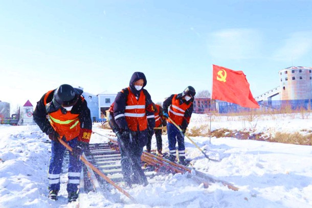 雁寶能源黨員突擊隊清掃鐵路上的積雪保障外運(yùn)安全
