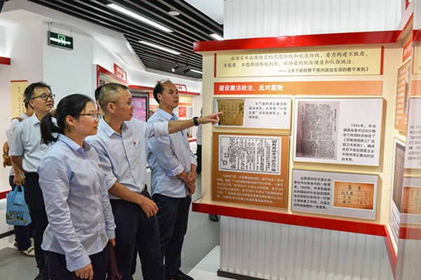 在龍巖市黨員政治生活館內(nèi),黨員干部、入黨積極分子們?cè)跈C(jī)器人“講解員”的帶領(lǐng)下,依次參觀了“黨內(nèi)政治生活的百年歷程”、“黨內(nèi)政治生活的閩西蘇區(qū)探索”展區(qū),通過觀看文獻(xiàn)資料、歷史圖片、實(shí)物展覽、宣教視頻等了解了不同時(shí)期黨內(nèi)政治生活的探索和發(fā)展歷程,真切感受到老一輩無產(chǎn)階級(jí)革命家在艱苦的斗爭環(huán)境中不搞特權(quán)、帶頭講政治講黨性、發(fā)揚(yáng)黨內(nèi)民主、接受黨和群眾監(jiān)督、持續(xù)保持清正廉潔的優(yōu)良品質(zhì)。