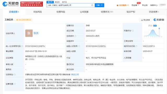近日,大唐(內(nèi)蒙古)能源開發(fā)有限公司成立,法定代表人為張洪,注冊資本50億人民幣,經(jīng)營范圍包括供電業(yè)務;輸電、供電、受電電力設施的安裝、維修和試驗;電氣安裝服務;熱力生產(chǎn)和供應;太陽能發(fā)電技術服務;新興能源技術研發(fā)等。