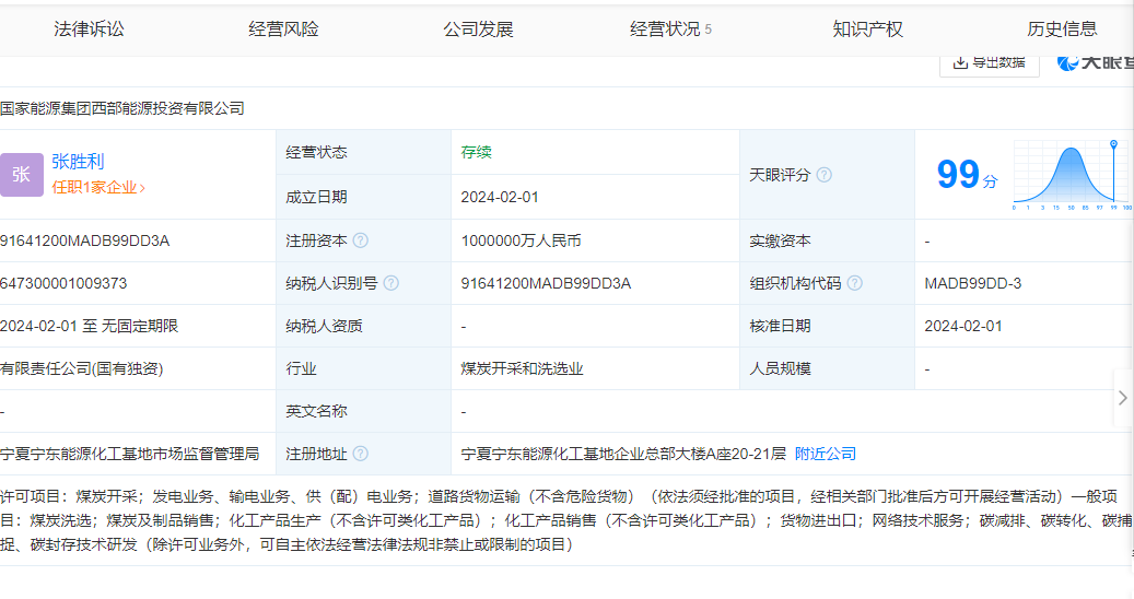 近日,國家能源集團(tuán)西部能源投資有限公司注冊成立,位于寧夏回族自治區(qū)銀川市,法定代表人為張勝利,注冊資本100億人民幣。