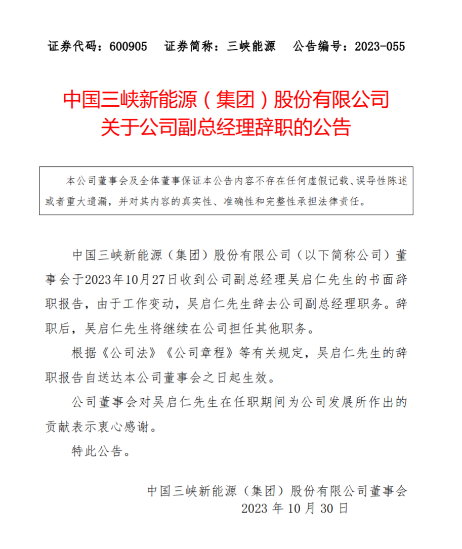 三峽能源10月30日公告稱,公司董事會于2023年10月27日收到副總經(jīng)理吳啟仁先生的書面辭職報(bào)告,由于工作變動(dòng),吳啟仁先生辭去公司副總經(jīng)理職務(wù)。辭職后,吳啟仁先生將繼續(xù)在公司擔(dān)任其他職務(wù)。
