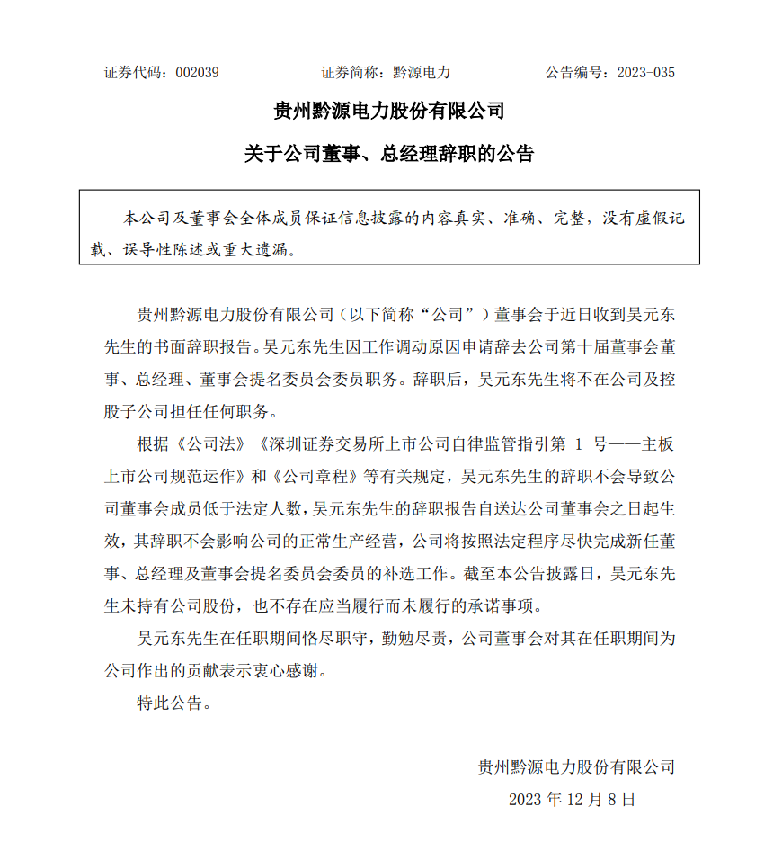 黔源電力12月8日發(fā)布公告稱,公司董事會于近日收到吳元東先生的書面辭職報告。吳元東先生因工作調動原因申請辭去公司第十屆董事會董事、總經理、董事會提名委員會委員職務。辭職后,吳元東先生將不在公司及控股子公司擔任任何職務。