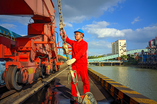 圖為燃料維護人員在檢查卸船機防風(fēng)纜