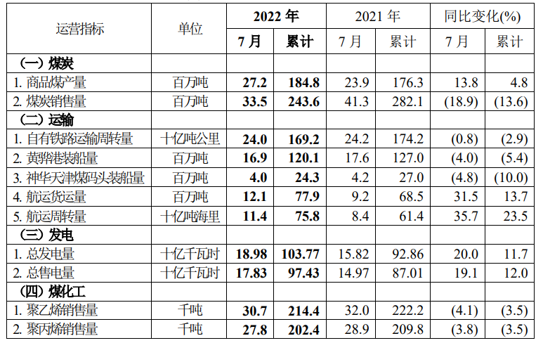 中國神華發(fā)布2022年7月份主要運(yùn)營數(shù)據(jù)。2022年7月,中國神華總發(fā)電量189.8億千瓦時(shí),同比增長20.0%;2022年1-7月,中國神華總發(fā)電量1037.7億千瓦時(shí),同比增長11.7%。