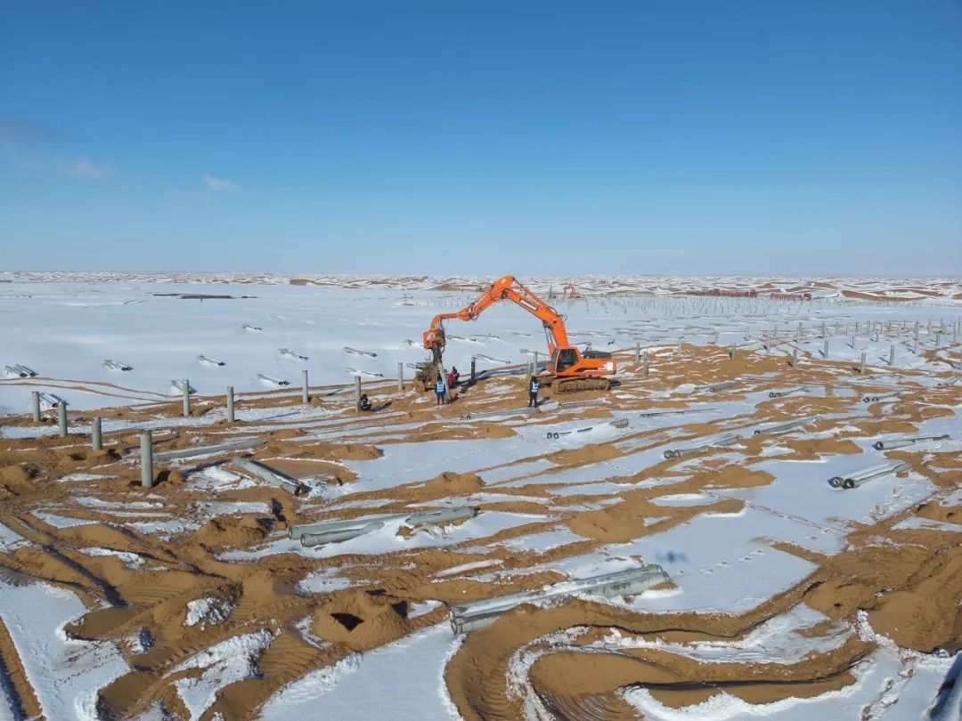 寧夏騰格里沙漠新能源基地二期200萬千瓦光伏項(xiàng)目建設(shè)人員正在進(jìn)行打樁作業(yè)。