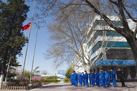 上午9時50分,來自各個崗位的30余名干部職工紛紛停下了手中的工作,集結(jié)一起,面向國旗整齊列隊。10時,防空警報鳴響,職工們懷著萬分悲痛的心情默哀三分鐘。