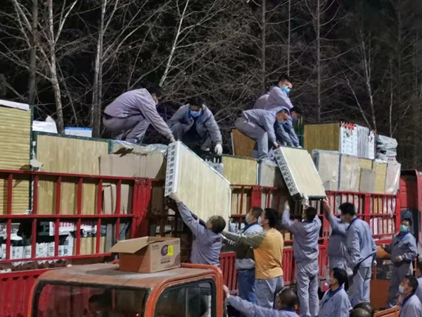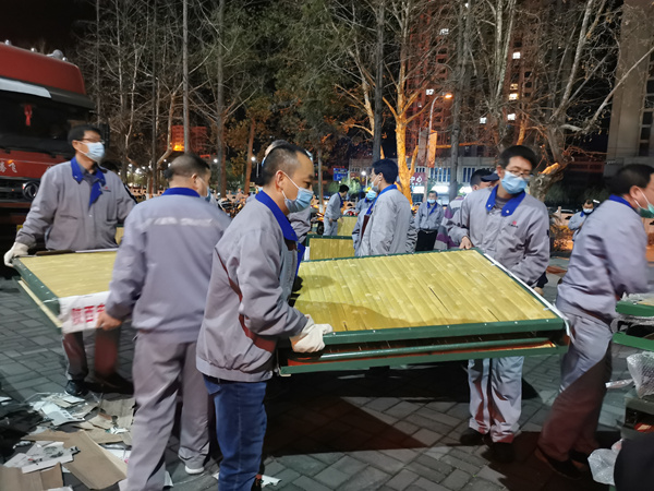晚上21:40,行軍床運到,中層干部、共產(chǎn)黨員、一線職工不分你我、爭先恐后爬上卡車搬運。“大家戴上手套,注意安全,別傷著自己。”就在此時,一直掛念著駐廠職工們的該公司黨委書記、總經(jīng)理任寶銅也來到了現(xiàn)場,親切的囑咐大家做好防護(hù)、小心搬運。