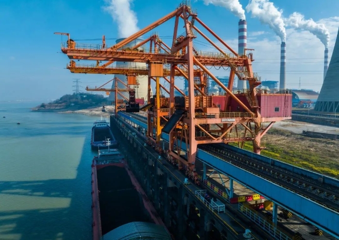 鄂州電廠運煤碼頭正在卸煤