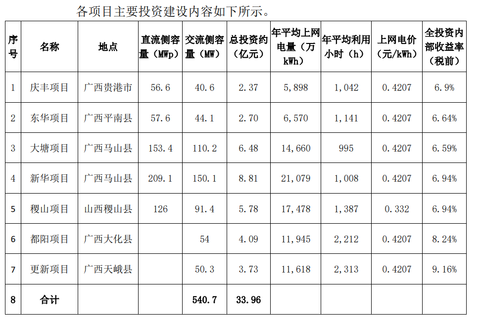 慶豐項目等5個光伏項目建設期約4-6個月,都陽項目、更新項目兩個風電項目建設期約12個月。