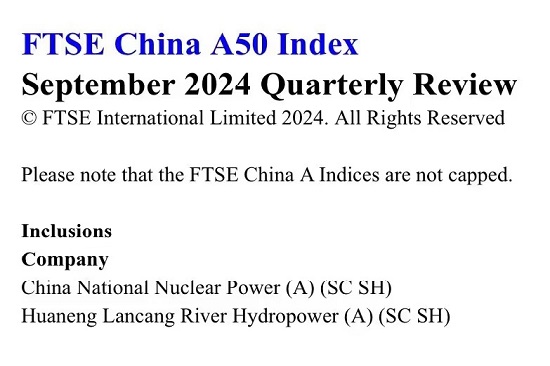 富時(shí)羅素(FTSE Russell)9月4日宣布對(duì)富時(shí)中國(guó)A50指數(shù)進(jìn)行季度審核變更,納入華能水電等兩只股票,本次變更于9月20日生效。在今年8月,華能水電股票也被納入明晟(MSCI)中國(guó)指數(shù)。
