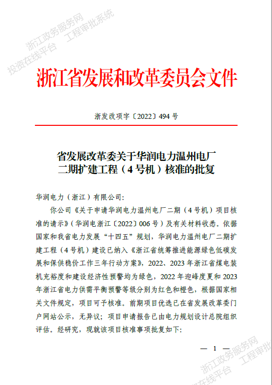 11月8日,華潤電力浙江公司溫州電廠4號機正式獲得浙江省發(fā)展和改革委員會核準(zhǔn)批復(fù)。