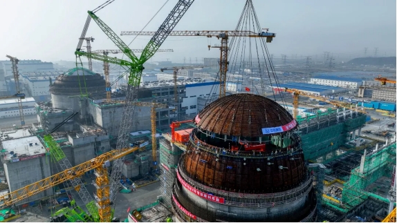 田灣核電8號機組穹頂為直徑44米的半球形結(jié)構(gòu),分球帶和球冠兩部分,總重量601.37噸,這是國內(nèi)最重的薄殼鋼襯里穹頂。江蘇核電堅決貫徹全民國家全教育日“總體國家安全觀·創(chuàng)新引領(lǐng)10周年”的主題要求,在現(xiàn)場拼裝中創(chuàng)新采用了自主研發(fā)的激光智能跟蹤焊接技術(shù),填補了國內(nèi)的空白。充分落實“安全第一,質(zhì)量第一”的管理方針,確保此次球冠吊到63米高空后,平穩(wěn)控制落在56.869米的球帶上口,并且偏差精度控制在毫米級別,確保核安全絕無一失。