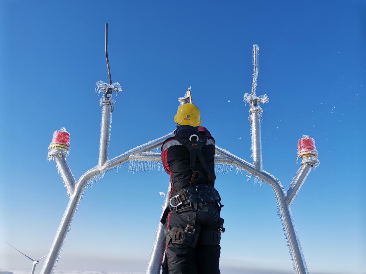 11月11日至12日,陽光透過薄薄的云層,照耀著白茫茫的大地,反射出銀色的光芒。風(fēng)機逐漸恢復(fù)運行,在重力和風(fēng)機葉片旋轉(zhuǎn)的作用下,裹冰會從葉片上脫落,由于受旋轉(zhuǎn)葉片的離心力作用,這些冰在沒有障礙物遮擋的情況下會被拋出數(shù)百米遠,存在安全隱患。風(fēng)電場隨即組織人員挨家挨戶告訴村民,近期不得靠近風(fēng)機,注意人身安全。之后開展機組風(fēng)速儀、風(fēng)向標除冰工作,全面降低機組不可用時間,保障機組供電穩(wěn)定可靠。本次除冰消缺充分利用上海電氣風(fēng)機監(jiān)控系統(tǒng)后臺,通過對比機組風(fēng)速和風(fēng)向、功率等數(shù)據(jù),分析判斷機組覆冰情況,對因雨雪冰凍天氣導(dǎo)致的風(fēng)速儀、風(fēng)向標覆冰從而影響機組功率的問題,及時派出“破冰突擊隊”。但是機艙頂部由于積雪、結(jié)冰,變得十分光滑。工作人員佩戴好安全帶,掛好雙鉤,迎難而上,勇敢破冰。同時也對加熱器、溫度傳感器及相關(guān)回路進行細致檢查,對無法正常運行的加熱器進行及時更換,確保設(shè)備加熱良好,回路接線無松動,風(fēng)速儀、風(fēng)向標工作正常。