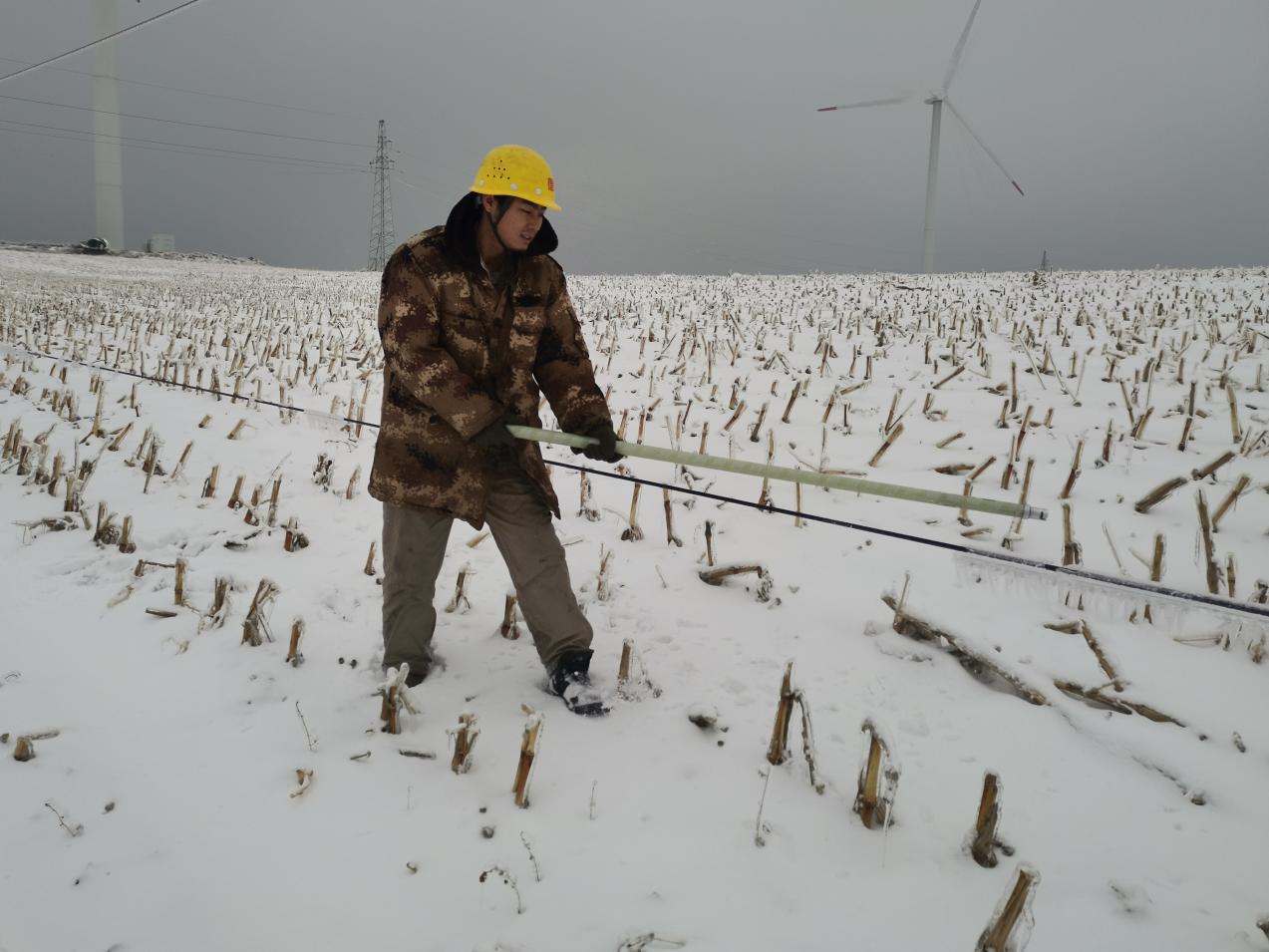11月10日,瑟瑟寒風(fēng)能吹開地上的積雪,卻無法阻止破冰小隊的腳步。這場持續(xù)兩天的雨雪剛一停,風(fēng)電場立即組織人員兵分兩路,迅速趕往現(xiàn)場。一組對升壓站35kV側(cè)通訊光纖、220kV側(cè)高壓一次設(shè)備采取人工打冰的方式對覆冰部位進行處理,確保線路安全,以及再對升壓站電纜溝蓋板進行清掃。另一組首先對風(fēng)機變頻器冷卻風(fēng)扇散熱網(wǎng)上的“冰罩”進行破冰。避免風(fēng)機復(fù)位運行后,變頻器冷卻風(fēng)扇散熱不及時的情況,導(dǎo)致設(shè)備損壞。之后再對線路進行檢查,因受大風(fēng)和凍雨混合雙打,集電線路被冰包裹得嚴嚴實實的。經(jīng)檢查后并無損壞,否則電線結(jié)冰后,既要承受冰掛的重量,加上風(fēng)的影響,致使電線被壓斷。同時,電塔也可能會承受較往常多十幾倍的電線重量,從而造成傾倒或折斷。還好只是塔架固定掉落,加上冰的重量才“葛優(yōu)躺”在地面上?,F(xiàn)場用絕緣桿進行人工敲打。隨著敲打的進行,電纜逐漸升起,這也減少了發(fā)生事故的可能。