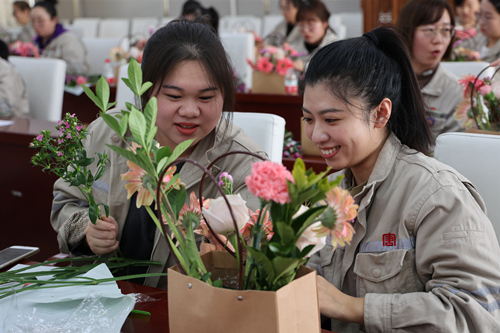 在公司“妙手生花 璽印芳華”慶“三八”創(chuàng)意插花活動現(xiàn)場,大家正興趣盎然、興高采烈的精心制作插花作品,不時傳來陣陣歡聲笑語。