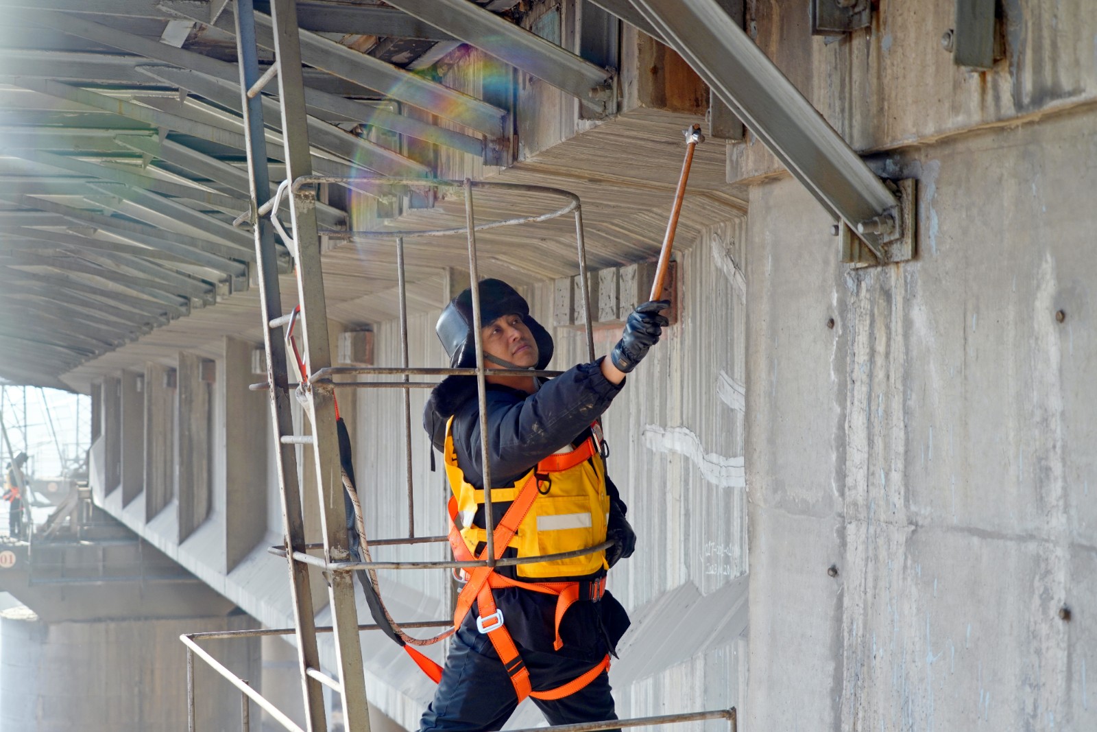 到達(dá)橋墩后的樊計林,掛好安全帶,如同變了一個人似的。在橋梁兩接頭處狹小的空間中閃轉(zhuǎn)騰挪,一會兒用檢查錘敲打螺栓,一會兒敲擊梁體,一會兒拿出卷尺測量,一會兒拿出扳手緊固螺栓……他們每個人從登上橋墩就開始忙忙碌碌,一刻不停。任憑寒風(fēng)在耳旁嘶吼。