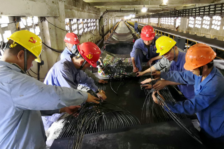 P106B膠帶整體更換膠帶全長2300米,共需硫化接頭20個,是整個輸煤系統(tǒng)膠帶更換工作中最難啃的一塊"硬骨頭"。為確保此次膠帶更換工作順利完成,該公司多次召開檢修專題討論會,制定了組織、安全、技術措施及詳細的施工方案,成立兩個硫化組,一個物資保障收放組,實行24小時輪班作業(yè),保證施工的持續(xù)性和連貫性。針對舊膠帶的拆除、拖拽、新膠帶的吊裝、鋪設等施工難點,創(chuàng)新工作思路,開展技術攻關破解難題,自制了自動卷帶機,減少了人工投入,極大提高了工作效率,特別是在攻克硫化接頭方面,嚴格施工標準和工藝流程操作,經(jīng)過斷帶、剝鋼絲繩、芯膠面膠鋪整、硫化機緊固、加壓、加熱、再進行保溫降溫等施工程序,每個頭用時8多個小時,做到精益求精,確保一次硫化成功,保證硫化質量。