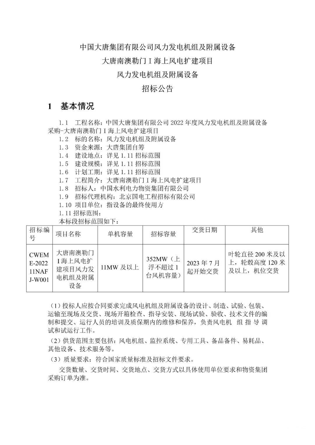 根據(jù)公告,此次招標(biāo)要求單機(jī)容量11MW及以上,葉輪直徑200米及以上,輪轂高度120米及以上,機(jī)位交貨。招標(biāo)容量352MW(上浮不超過1臺(tái)風(fēng)機(jī)容量)。交貨期定于2023年7月起。