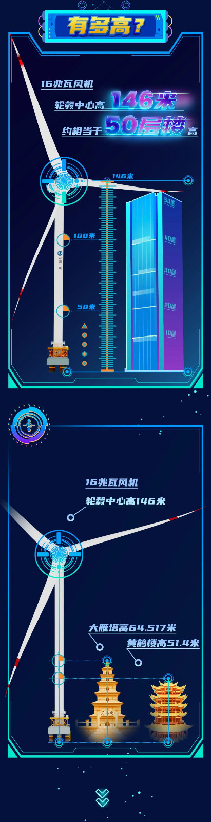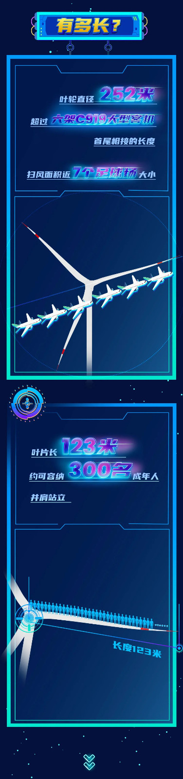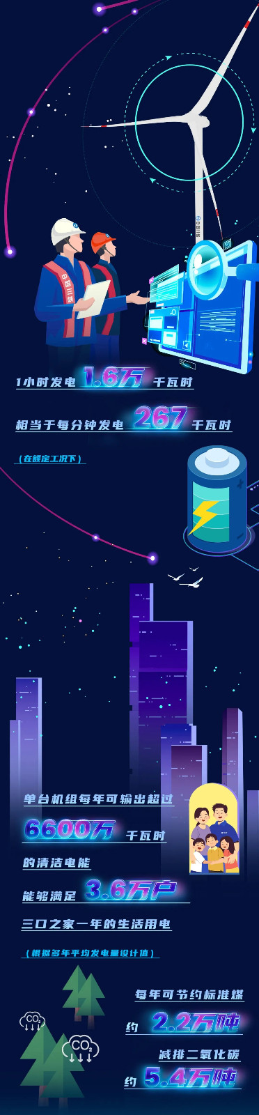 此次下線的單機(jī)容量16兆瓦海上風(fēng)電機(jī)組,葉輪直徑252米,葉輪掃風(fēng)面積約5萬(wàn)平方米,約相當(dāng)于7個(gè)標(biāo)準(zhǔn)足球場(chǎng)大;輪轂高度達(dá)146米,約相當(dāng)于一座50層大樓的高度。在額定工況下,單臺(tái)機(jī)組每轉(zhuǎn)動(dòng)一圈可發(fā)電34.2千瓦時(shí)。根據(jù)多年平均發(fā)電量設(shè)計(jì)值,單臺(tái)機(jī)組每年可輸出超過(guò)6600萬(wàn)千瓦時(shí)的清潔電能,能夠滿足3.6萬(wàn)戶三口之家一年的生活用電,可節(jié)約標(biāo)煤約2.2萬(wàn)噸,減排二氧化碳約5.4萬(wàn)噸。