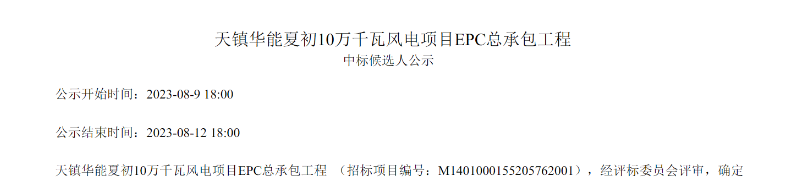 8月9日,中國招標(biāo)投標(biāo)公共服務(wù)平臺發(fā)布《天鎮(zhèn)華能夏初10萬千瓦風(fēng)電項目EPC總承包工程中標(biāo)候選人公示》的公告。