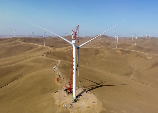 圖為霍林河循環(huán)經(jīng)濟(jì)示范工程火電靈活性改造促進(jìn)市場化消納新能源試點(diǎn)項(xiàng)目30萬千瓦風(fēng)電項(xiàng)目施工現(xiàn)場,風(fēng)機(jī)葉輪正在吊裝 圖片來源:國家電投內(nèi)蒙古公司