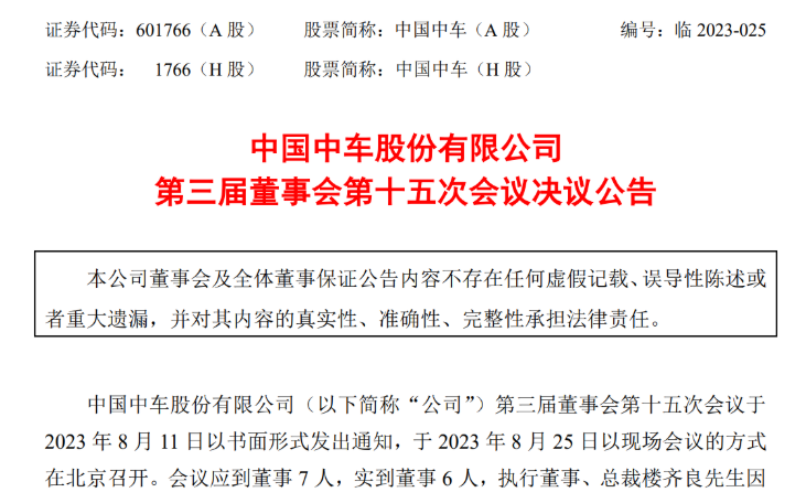 近日,中國中車股份有限公司(以下簡稱“中國中車”或“公司”)發(fā)布《第三屆董事會第十五次會議決議公告》。