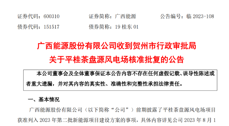 公告披露,2023年11月6日,廣西能源收到《賀州市行政審批局關(guān)于平桂茶盤源風(fēng)電場(chǎng)核準(zhǔn)的批復(fù)》(賀審批項(xiàng)目〔2023〕1 號(hào)),核準(zhǔn)建設(shè)平桂茶盤源風(fēng)電場(chǎng)項(xiàng)目。