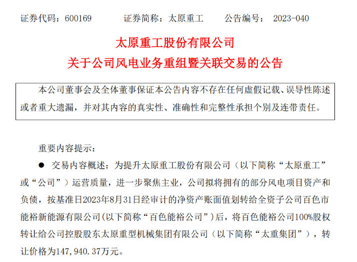 公告披露,太原重工擬將擁有的部分風電項目資產和負債,按基準日2023年8月31日經審計的凈資產賬面值劃轉給全資子公司百色市能裕新能源有限公司(以下簡稱“百色能裕公司”)后,將百色能裕公司100%股權轉讓給公司控股股東太原重型機械集團有限公司(以下簡稱“太重集團”),轉讓價格為147,940.37萬元。