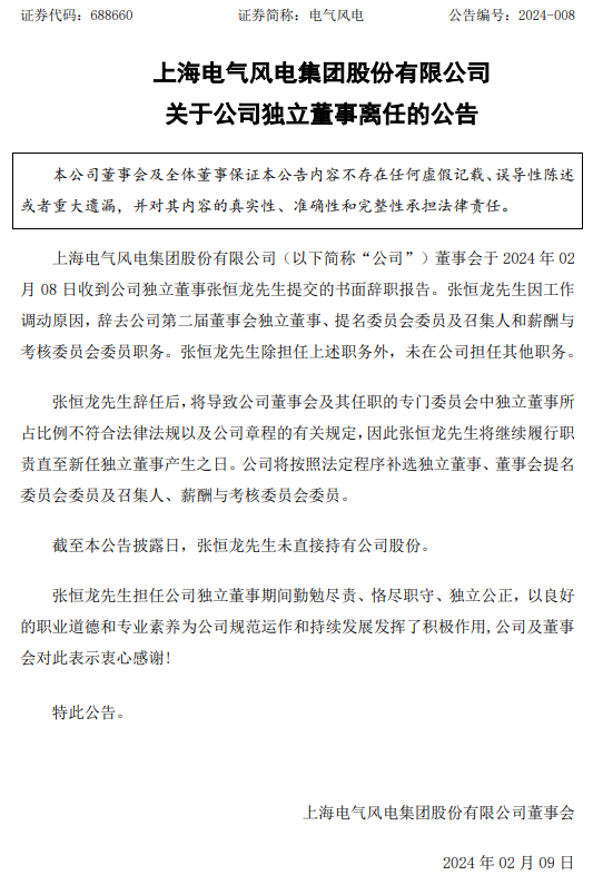 公告稱,電氣風(fēng)電董事會(huì)于2024年2月8日收到公司獨(dú)立董事張恒龍先生提交的書(shū)面辭職報(bào)告。張恒龍先生因工作調(diào)動(dòng)原因,辭去公司第二屆董事會(huì)獨(dú)立董事、提名委員會(huì)委員及召集人和薪酬與考核委員會(huì)委員職務(wù)。張恒龍先生除擔(dān)任上述職務(wù)外,未在公司擔(dān)任其他職務(wù)。