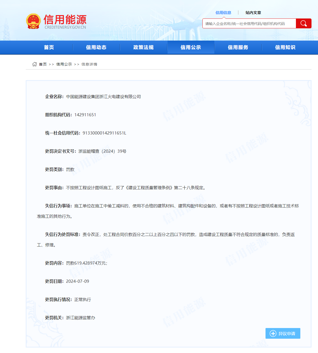 浙江能源監(jiān)管辦發(fā)布的《行政處罰決定書》(浙監(jiān)能稽查〔2024〕39號(hào))中依據(jù)《建設(shè)工程質(zhì)量管理?xiàng)l例》(下稱“條例”)第六十四條對(duì)中國(guó)能建浙江火電處以了619萬余元的罰款。條例明確:施工單位在施工中偷工減料的,使用不合格的建筑材料、建筑構(gòu)配件和設(shè)備的,或者有不按照工程設(shè)計(jì)圖紙或者施工技術(shù)標(biāo)準(zhǔn)施工的其他行為的,責(zé)令改正,處工程合同價(jià)款百分之二以上百分之四以下的罰款;造成建設(shè)工程質(zhì)量不符合規(guī)定的質(zhì)量標(biāo)準(zhǔn)的,負(fù)責(zé)返工、修理,并賠償因此造成的損失;情節(jié)嚴(yán)重的,責(zé)令停業(yè)整頓,降低資質(zhì)等級(jí)或者吊銷資質(zhì)證書。