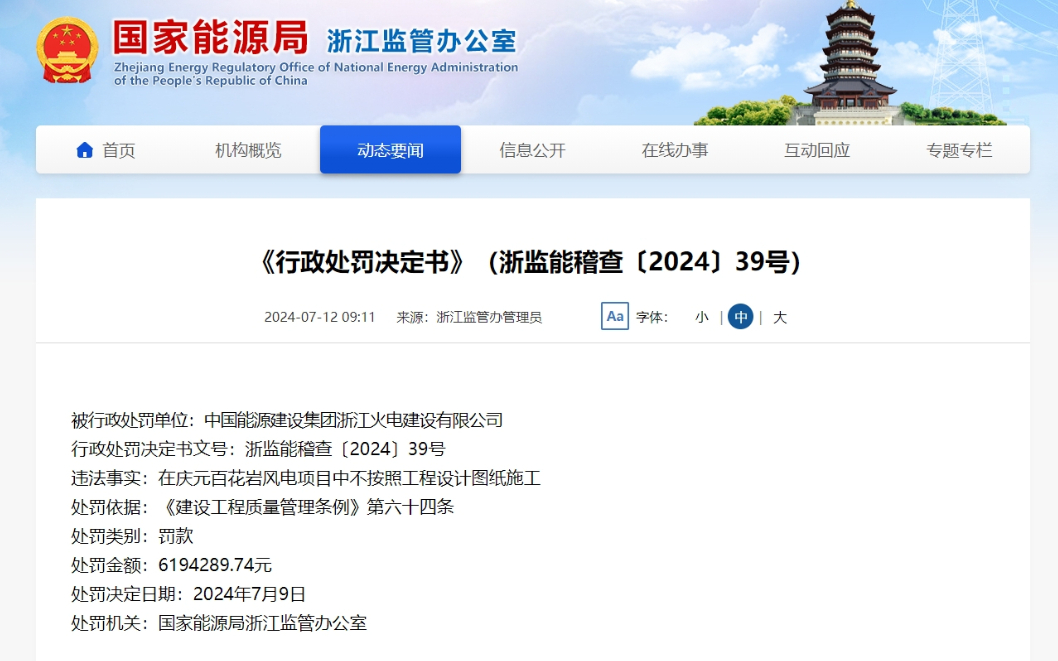 近日,國(guó)家能源局浙江監(jiān)管辦公室發(fā)布的《行政處罰決定書》(浙監(jiān)能稽查〔2024〕39號(hào))顯示,中國(guó)能源建設(shè)集團(tuán)浙江火電建設(shè)有限公司在慶元百花巖風(fēng)電項(xiàng)目中不按照工程設(shè)計(jì)圖紙施工,被處以619.428974萬元罰款。