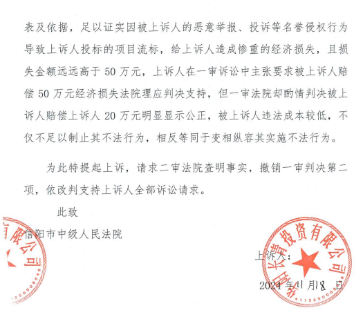 8、2024年11月18日,華陽(yáng)長(zhǎng)青公司提交《上訴狀》(依據(jù)第一個(gè)判決書,上訴已超時(shí)),請(qǐng)求“1、依法撤銷固始縣人民法院做出的(2024)豫1525 民初 6011號(hào)民事判決第二項(xiàng),依法改判被上訴人賠償上訴人因被上訴人侵權(quán)而給上訴人造成的經(jīng)濟(jì)損失50萬(wàn)元;維持判決第一項(xiàng);2、上訴費(fèi)用由被上訴人承擔(dān)。”