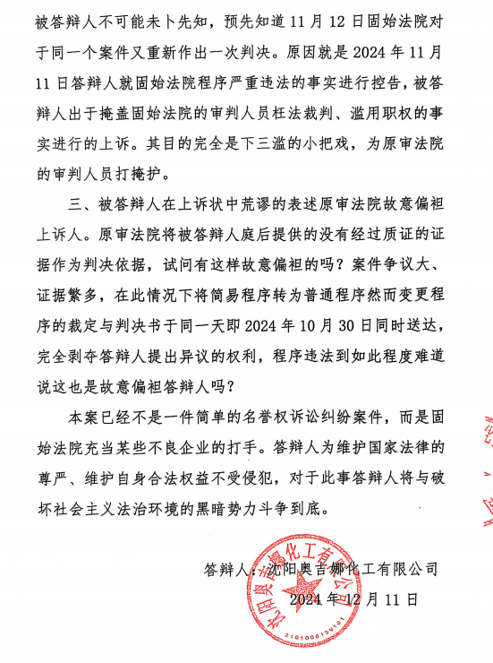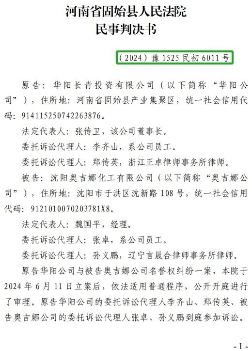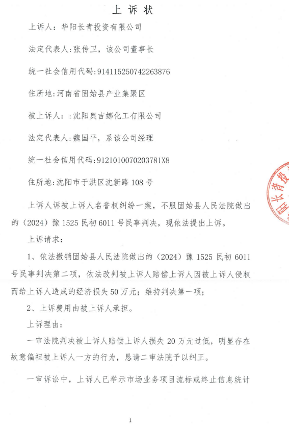 5、2024年10月30日,奧吉娜公司收到固始縣法院日期為2024年10月28日的《民事判決書》(2024)豫 1525 民初 6011 號(hào)。判決長(zhǎng)青公司勝訴如下:“一、被告沈陽(yáng)奧吉娜化工有限公司立即停止對(duì)原告華陽(yáng)長(zhǎng)青投資有限公司的舉報(bào)、投訴等名譽(yù)侵權(quán)行為,并于本判決生效后十五日內(nèi)在國(guó)家級(jí)報(bào)紙或全國(guó)生態(tài)環(huán)境網(wǎng)公開向原告賠禮道歉(不少于 30 日); 二、被告沈陽(yáng)奧吉娜化工有限公司于本判決生效后十五日內(nèi)賠償原告華陽(yáng)長(zhǎng)青投資有限公司損失200,000 元; 三、駁回原告華陽(yáng)長(zhǎng)青投資有限公司的其他訴訟請(qǐng)求。 案件受理費(fèi)8,800元,由原告華陽(yáng)長(zhǎng)青投資有限公司負(fù)擔(dān)4,500元,由被告沈陽(yáng)奧吉娜化工有限公司負(fù)擔(dān)4,300元。”