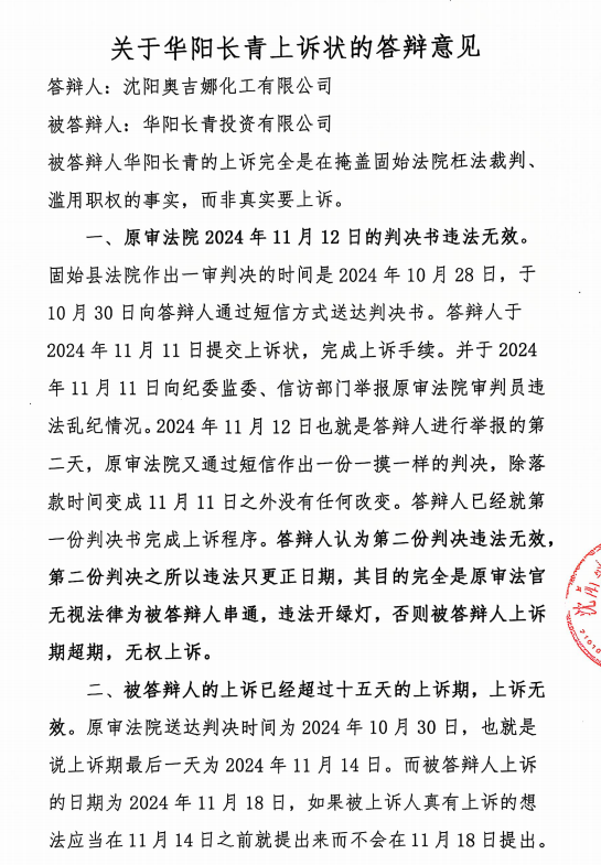 奧吉娜指證一審程序明目張膽嚴(yán)重違法、第二個(gè)判決書無(wú)效、華陽(yáng)長(zhǎng)青上訴無(wú)效