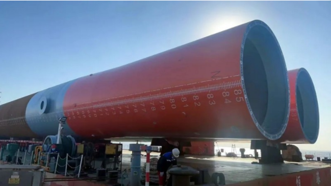 近日,子公司潤邦海洋為天津港航工程有限公司建造的1#、2#海上風電基礎樁順利發(fā)運,迎來了2023年項目交付的“開門紅”,也為圓滿完成2023年任務目標打開了新局面。1#基礎樁樁長87米,直徑8米,樁重1,339.64噸,2#基礎樁樁長85米,直徑8米,樁重1,305.97噸。