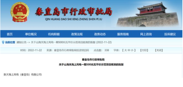 日前,河北秦皇島市行政審批局發(fā)布《關于山海關海上風電一期500兆瓦平價示范項目核準的批復》,同意建設該項目。