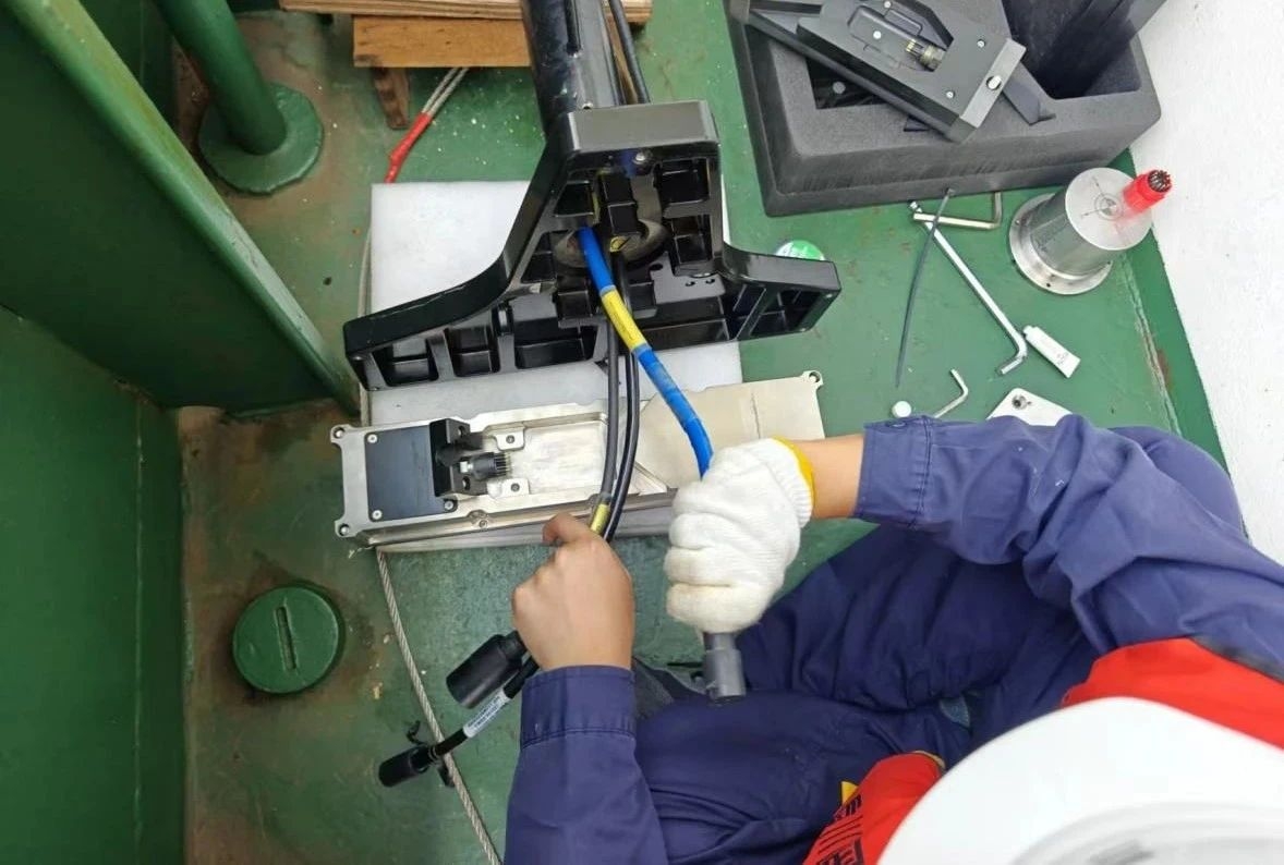 三峽能源江蘇運(yùn)維公司海工試驗(yàn)中心員工將多波束測深系統(tǒng)換能器從海里收回