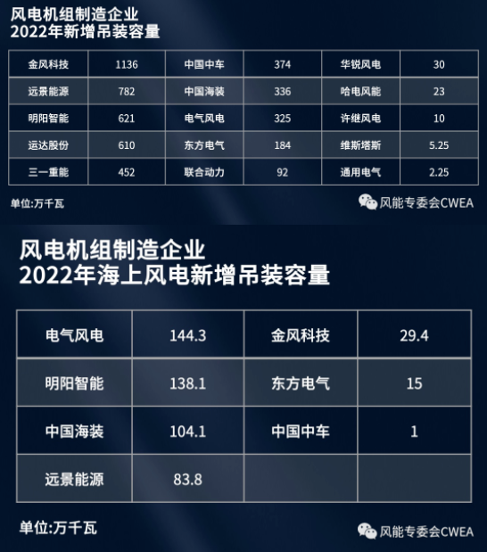 2022年,中國新增吊裝容量前五的風(fēng)電機組制造企業(yè)是金風(fēng)科技、遠景能源、明陽智能、運達股份、三一重能,其新增裝機容量分別為1136萬千瓦、782萬千瓦、621萬千瓦、610萬千瓦、452萬千瓦。