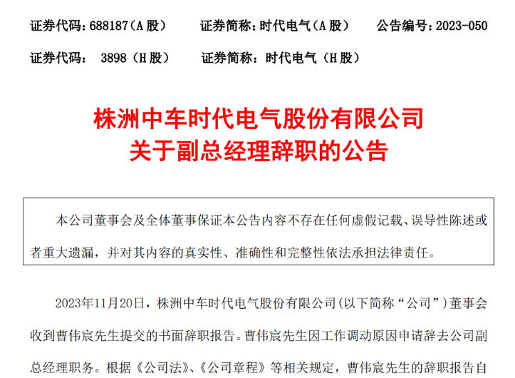 公告披露,2023年11月20日,時代電氣董事會收到曹偉宸先生提交的書面辭職報告。曹偉宸先生因工作調(diào)動原因申請辭去公司副總經(jīng)理職務(wù)。根據(jù)《公司法》、《公司章程》等相關(guān)規(guī)定,曹偉宸先生的辭職報告自送達董事會之日起生效。截至本公告披露日,曹偉宸先生未持有公司股份。