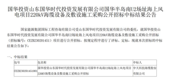 近日,國(guó)家能源招標(biāo)網(wǎng)發(fā)布《國(guó)華投資山東國(guó)華時(shí)代投資發(fā)展有限公司國(guó)華半島南U2場(chǎng)址海上風(fēng)電項(xiàng)目220kV海纜設(shè)備及敷設(shè)施工采購(gòu)公開(kāi)招標(biāo)中標(biāo)結(jié)果公告》。公告顯示,中天科技海纜股份有限公司成功中標(biāo)該項(xiàng)目,中標(biāo)價(jià)格為42111.942000萬(wàn)元。