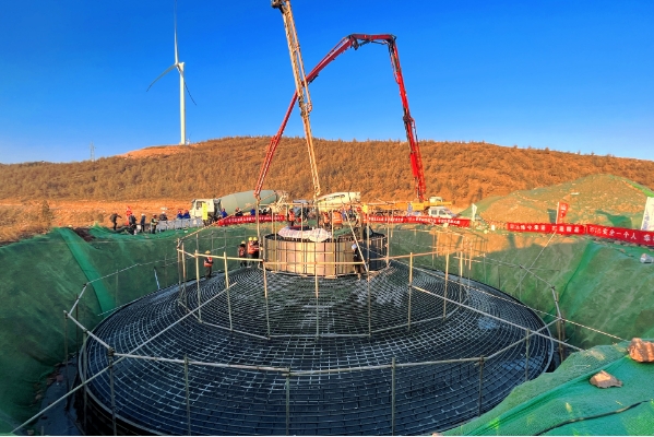 在河南省嵩縣項(xiàng)目建設(shè)現(xiàn)場(chǎng),一派熱火朝天的施工景象。嚴(yán)寒天氣中,中國(guó)節(jié)能首個(gè)產(chǎn)業(yè)助力鄉(xiāng)村振興重點(diǎn)項(xiàng)目——中節(jié)能嵩縣九皋鎮(zhèn)風(fēng)電場(chǎng)項(xiàng)目工程現(xiàn)場(chǎng)塔吊林立,運(yùn)輸車輛往來穿梭,基礎(chǔ)澆筑井然有序,以一個(gè)個(gè)風(fēng)機(jī)基礎(chǔ)構(gòu)成的“同心圓”應(yīng)了農(nóng)歷新年“和美團(tuán)圓”之意。