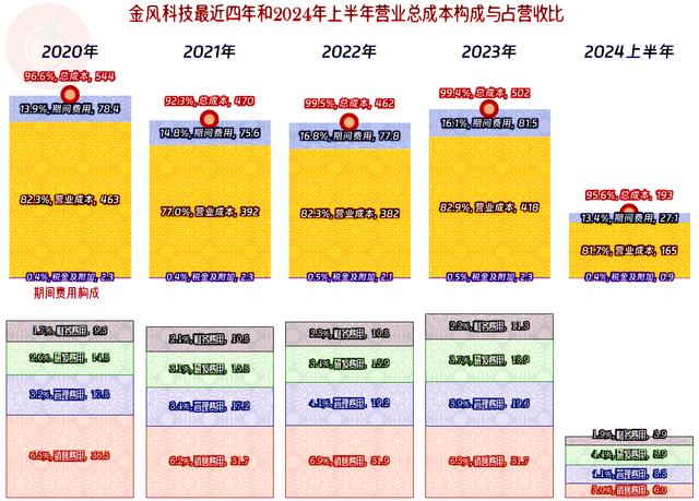 產(chǎn)生這些差異的主要原因是主營(yíng)業(yè)務(wù)盈利空間變化了,2020年是3.4個(gè)百分點(diǎn),2021年接近8個(gè)百分點(diǎn),遙遙領(lǐng)先。2022年和2023年就只有可憐的不到一個(gè)百分點(diǎn),與2020年毛利率差不多,主要差在期間費(fèi)用占營(yíng)收比上了,準(zhǔn)確說(shuō)是差在營(yíng)收規(guī)模比2020年低了。2024年上半年的期間費(fèi)用控制下來(lái)了,再加上營(yíng)收反彈,主營(yíng)業(yè)務(wù)盈利空間擴(kuò)大至了4.4個(gè)百分點(diǎn),比2020年高,但營(yíng)收規(guī)模上還有差距,就導(dǎo)致盈利能力還是要差一些。
