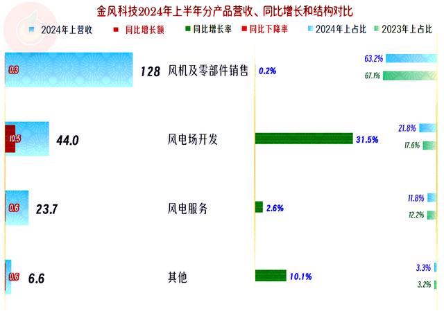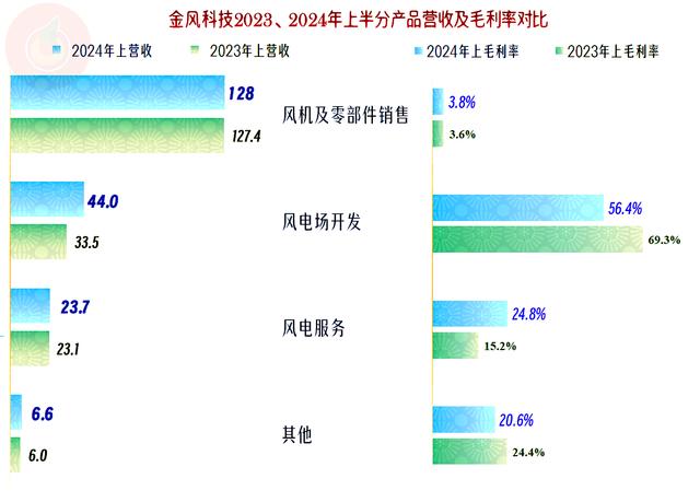 2024年上半年,金風(fēng)科技核心的“風(fēng)機(jī)及零部件銷(xiāo)售”業(yè)務(wù)毛利率小幅增長(zhǎng),但總體水平仍然很低;“風(fēng)電場(chǎng)開(kāi)發(fā)”業(yè)務(wù)的毛利率雖然大幅下降,但仍然超過(guò)了五成;“風(fēng)電服務(wù)”業(yè)務(wù)的毛利率有較大幅度增長(zhǎng),對(duì)平均毛利率的提升起到了不小的作用。