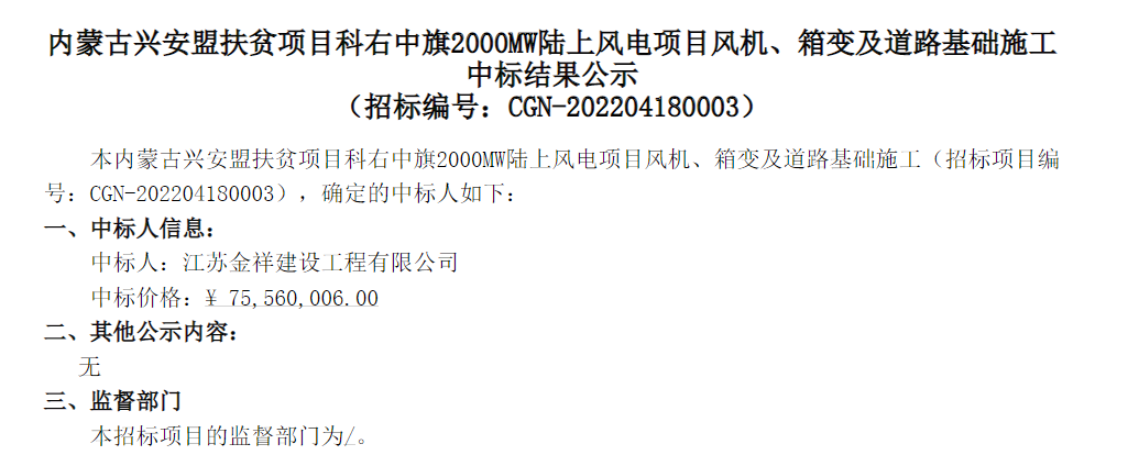 內(nèi)蒙古興安盟扶貧項目科右中旗2000MW陸上風電項目風機、箱變及道路基礎(chǔ)施工中標結(jié)果公示: